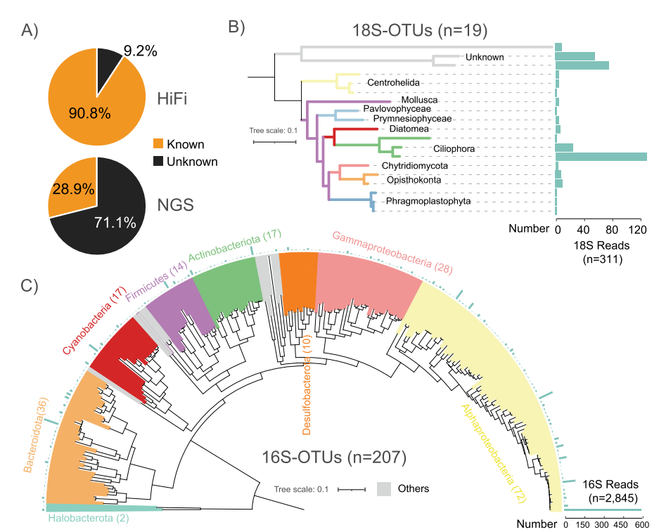 基于HiFi reads的分類分辨率。(A) HiFi和NGS讀數(shù)具有(已知)/不具有(未知)分類信息的百分比。(B和C)基于19個全長18S-OTUs (B)和207個全長16S-OTUs (C)的系統(tǒng)進化樹